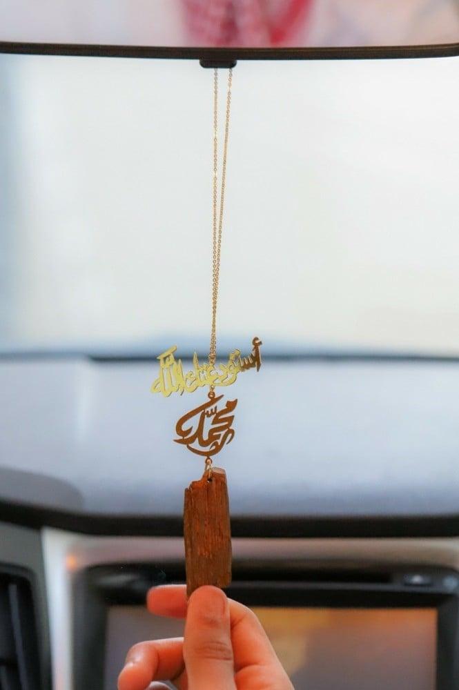 تعليقة سيارة عود موروكي مع اسم أو حرف وعبارة استودعتك الله بطلاء فضي أو ذهبي لا يصدأ. أجمل تعليقات سيارات وهدايا رجالية مصممة حسب الطلب